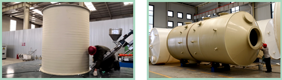 采用PPH螺旋擠出纏繞技術(shù)加工制作而成的全塑結(jié)構(gòu)的耐腐蝕塔器或常壓儲罐;取代了板材二次成型的舊工藝。